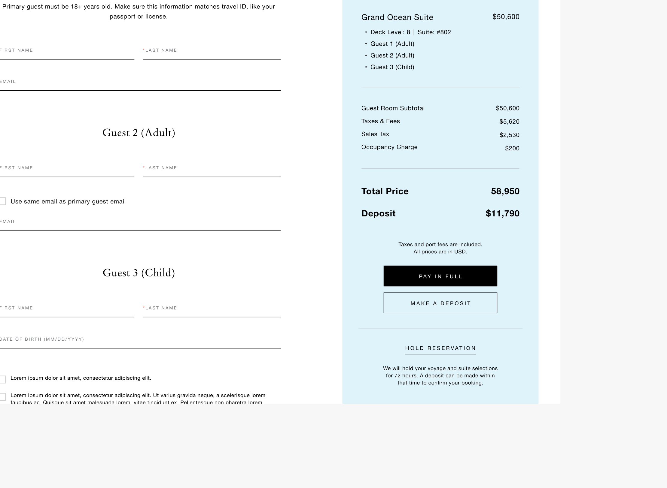 At this price point, payment isn't a checkout step — it's a relationship. Guests may put down a deposit months before sailing, with a balance due closer to departure. Some pay in full immediately. Some are managing payments across multiple parties in a group.