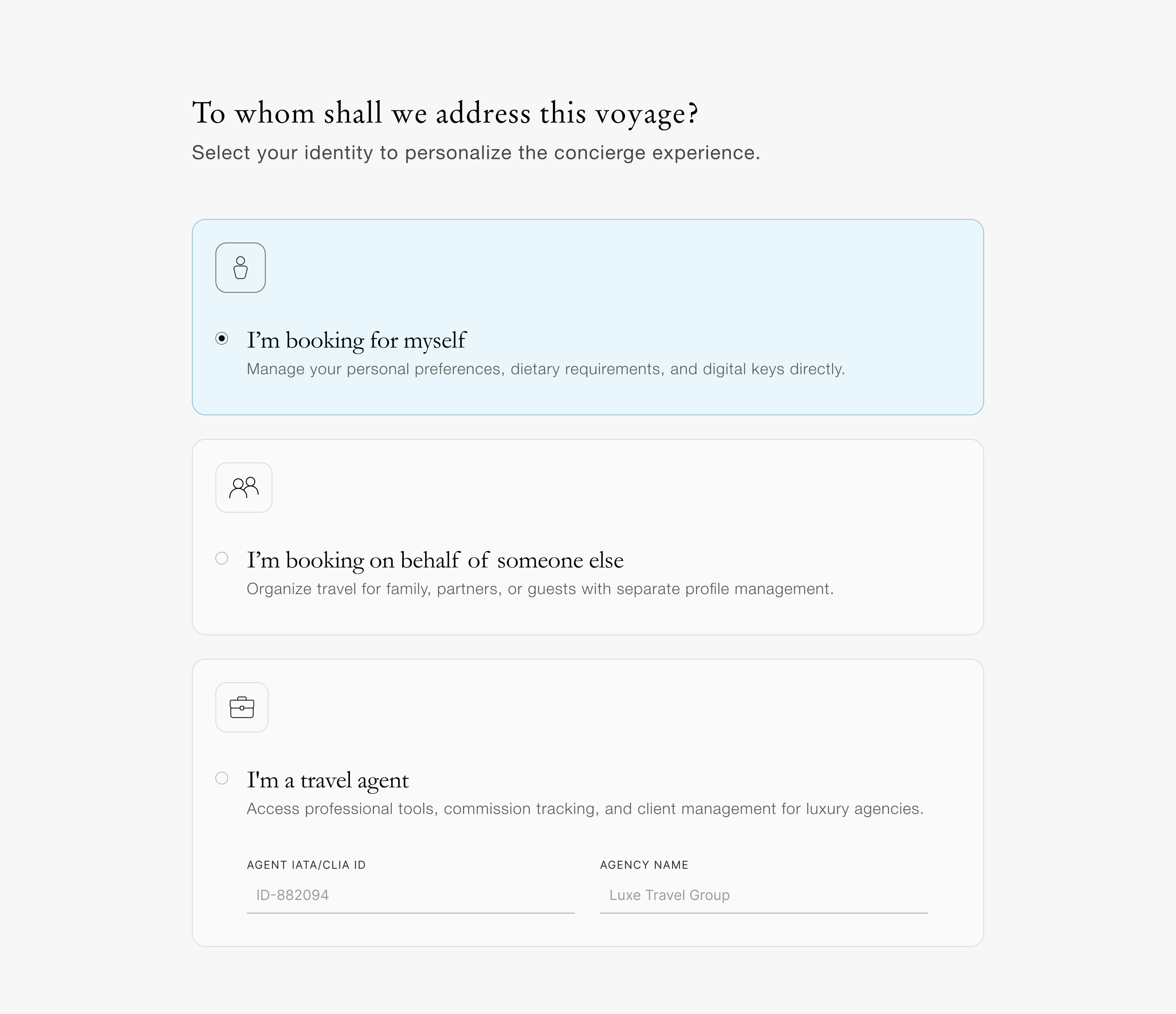 We identified three distinct contexts in which a booking gets made. Each has different needs, but the underlying system — suite selection, payment, guest assignment — is the same. The platform adapts its framing, not its structure.